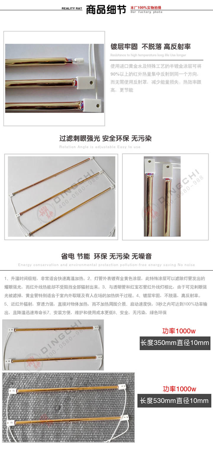 1、使用进口黄金水及特殊工艺的半镀金涂层可将90%以上的红外热量集中反射到同一个方向,而无需使用反射罩,减少能量损失。热效率跟高,更节能 2、升温时间极短,非常适合快速高温加热。 3、灯管外表镀有金黄色涂层,此特殊涂层可以滤除灯管发出的耀眼强光,而红外线热能却不受阻挡全部辐射出来。