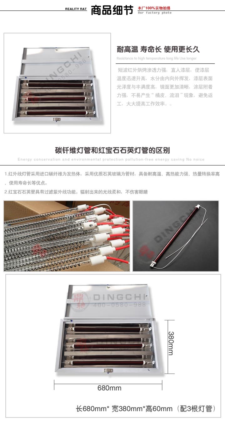 2、红宝石石英管具有过滤紫外线功能。辐射出来的光线柔和,不伤害眼睛 3、.加热效率高,可将95%以上的电能转化成红外辐射 4、.短波红外辐射,穿透力强,直接对物体加热,而不加热周围介质 5、.启动速度快,3秒之内可达到100%功率输出,且降温迅速