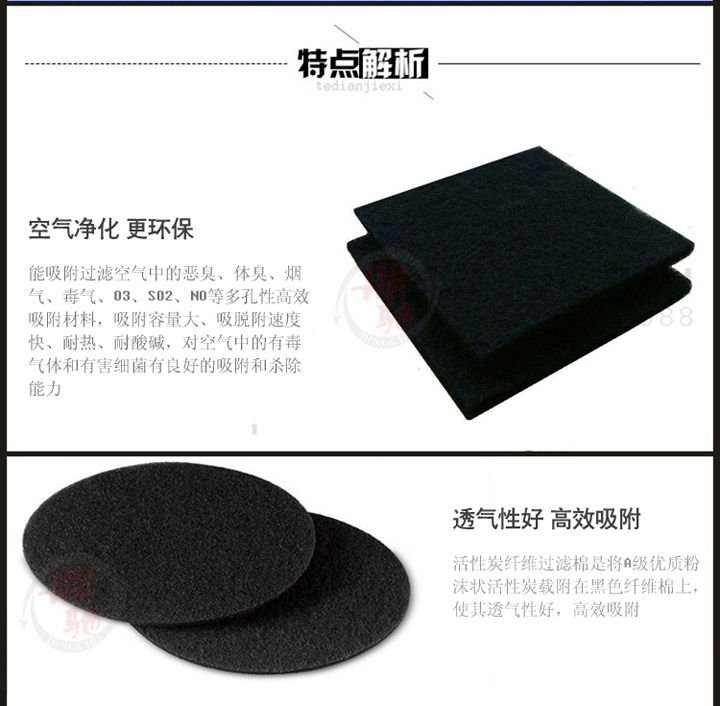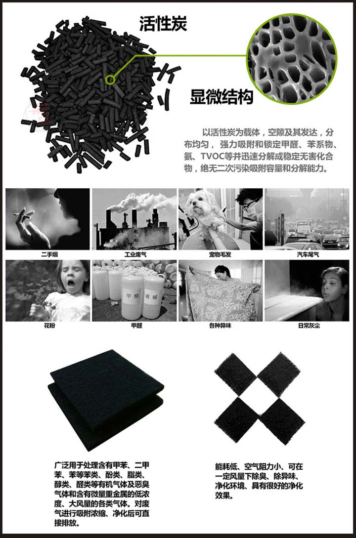以优质粉状性炭为吸附材料,将其附载纤维基体之上制成,具有良好的吸附性和集尘效果,成型性好(任意裁剪、折叠)、强度高、气流阻力较小,主要用于工业废气处理、油烟净化、各种家具、车用空调、空气过滤器配套,水质净化、气相吸附等。可单独使用,去除微尘、漆雾、臭味、及发挥性有效污染物苯、甲醛等;亦可与超细熔喷纤维、粗效过滤棉复合,达到更高滤尘、除臭功效。